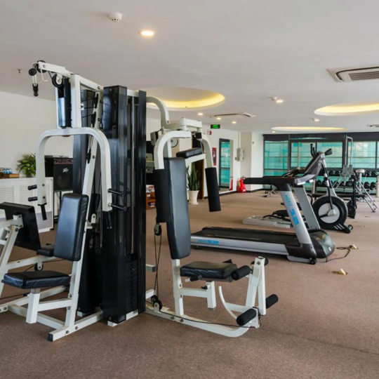 Phòng tập thể dục được trang bị đầy đủ tiện nghi, hiện đại như: máy tập cardio với màn hình TV LCD và hệ thống đo nhịp tim hiện đại cùng với máy nâng tạ, kéo dãn cơ thể,...