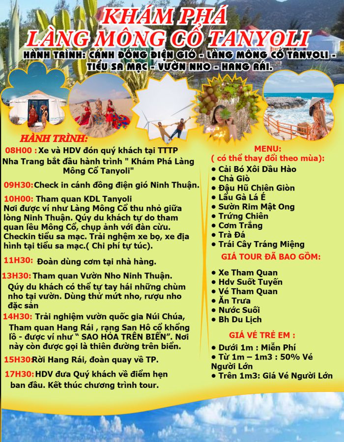 HÀNH TRÌNH: : Cánh Đồng Điện Gió - Làng Mông Cổ Tanyoli - Tiểu Sa Mạc - Vườn Nho - Hang Rái.